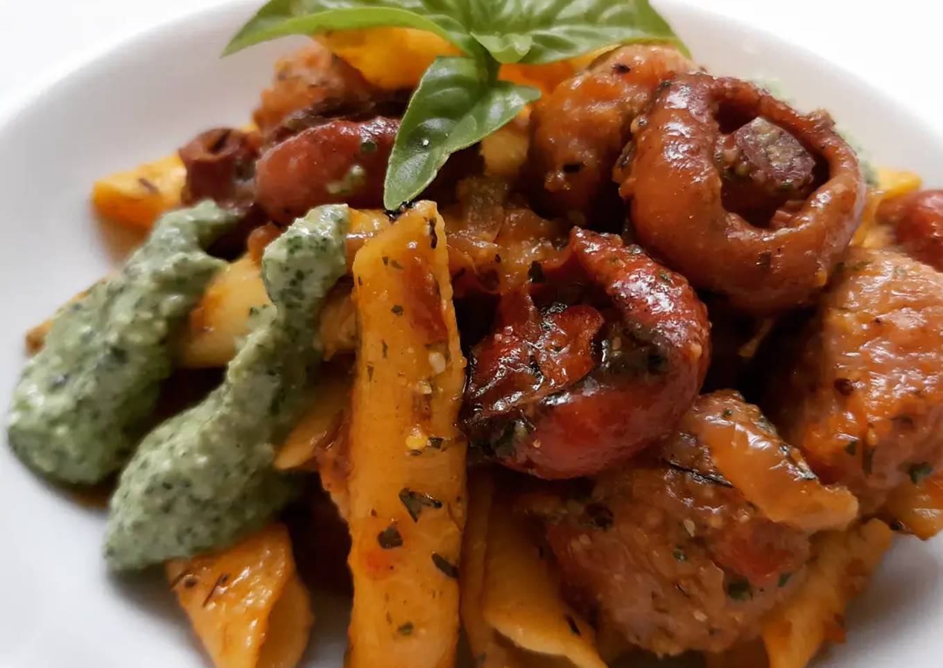 Garganelli con albóndigas, rovellons y cebolla caramelizada