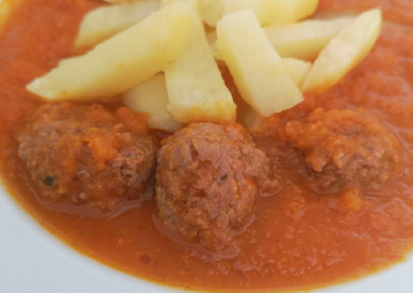 Albóndigas en salsa de zanahorias y naranja con patatas fritas