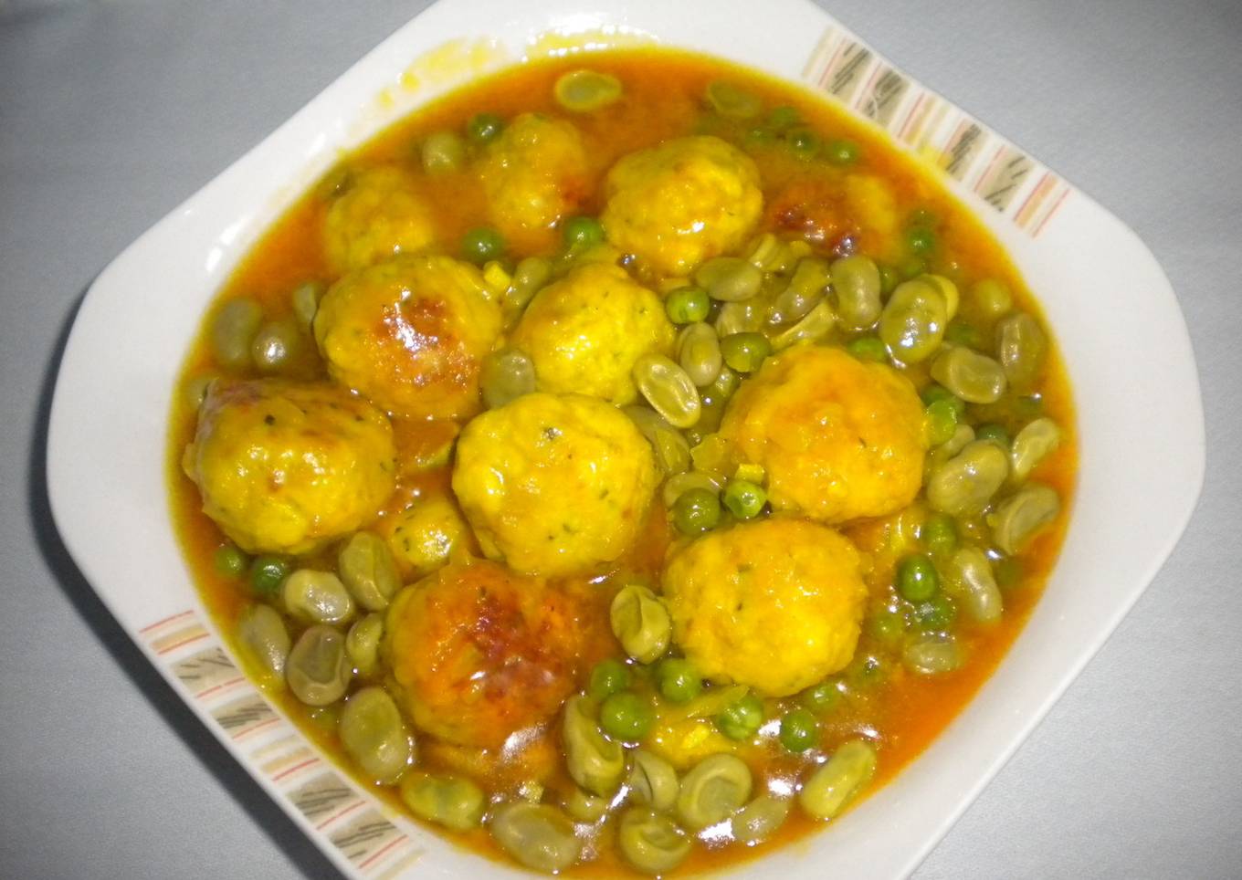 Albóndigas de pechuga de pollo con salsa de almendras, piel de naranja, vino, habas y pimentón.